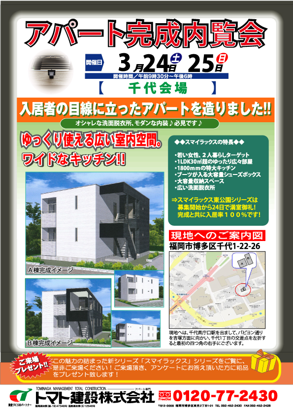 営業部浦川です。お疲れ様です。 来週土日に博多区千代にて内覧会を開催します。